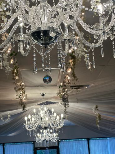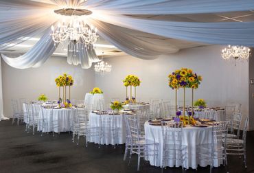 Welcome to our stunning event space, which is perfect for parties, showers, business meetings, corporate events, and special occasions. Our venue boasts a capacity of up to 150 guests and features beautiful chandeliers.